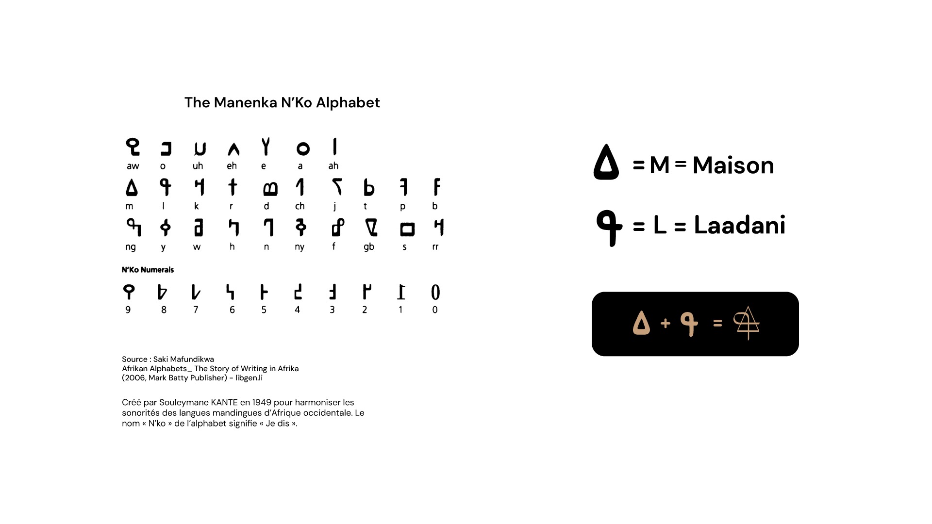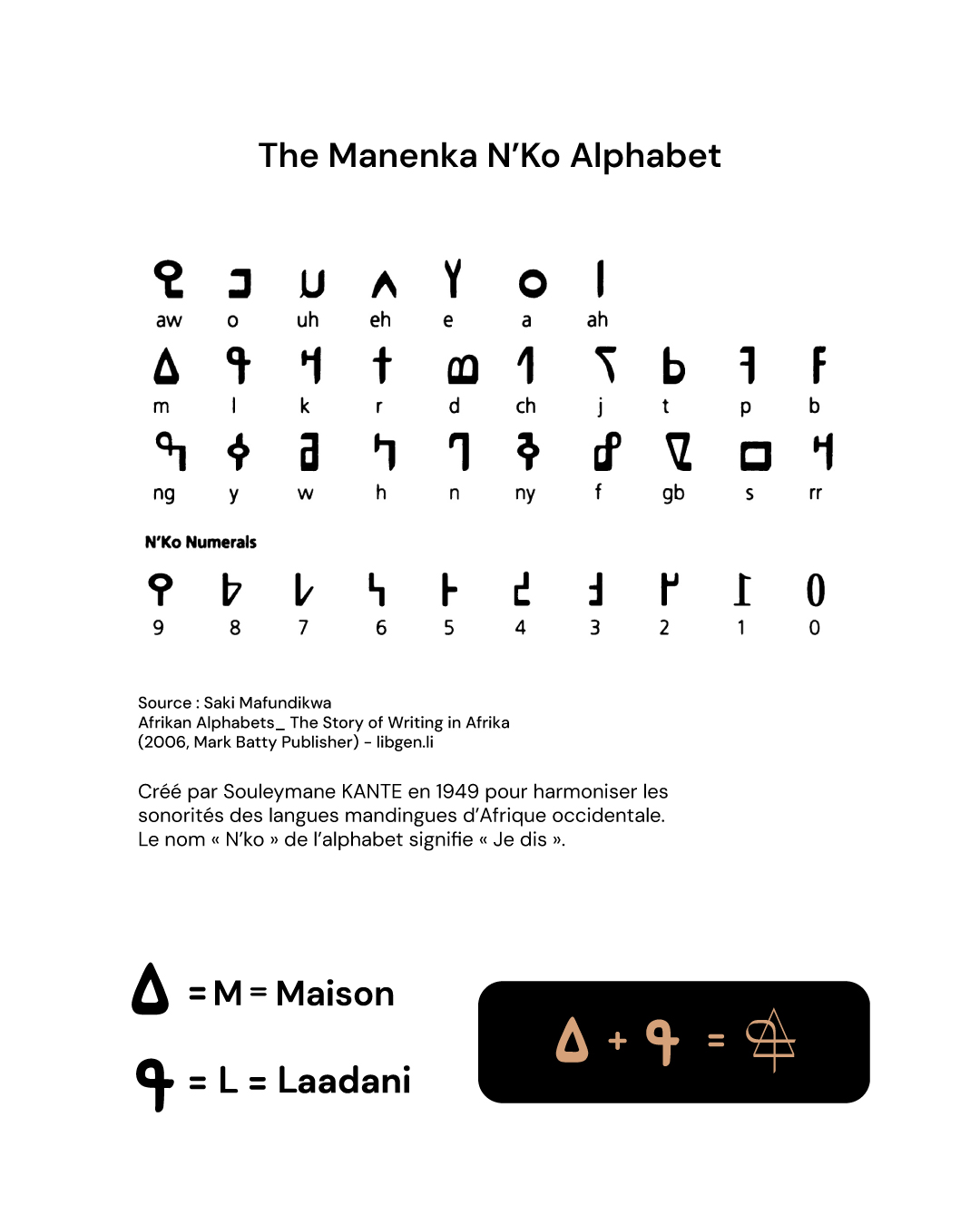 Le signe s’inspire de la lettre “L” de l’alphabet N’ko, système d’écriture créé en 1949 par Souleymane Kanté pour unifier les langues mandingues.