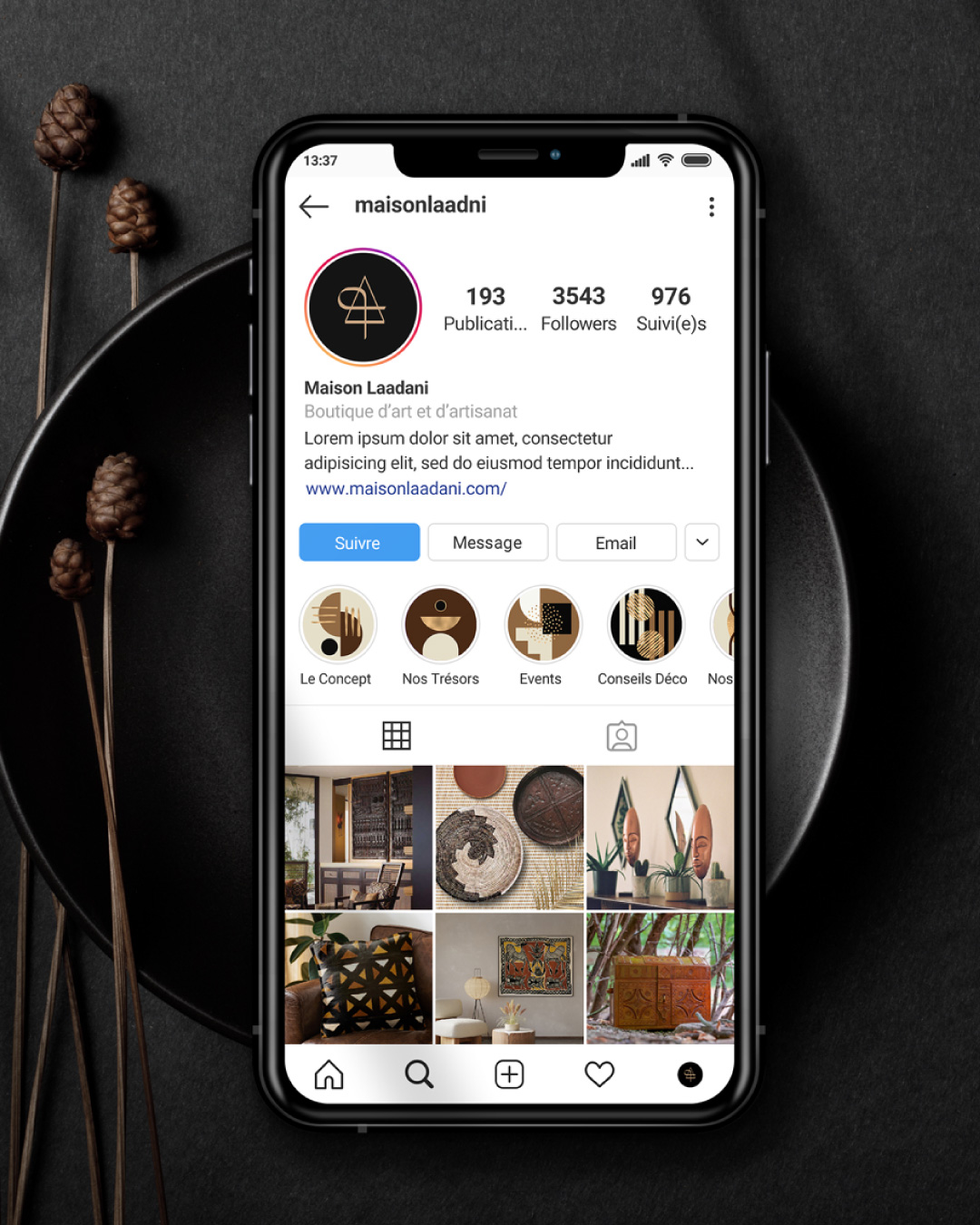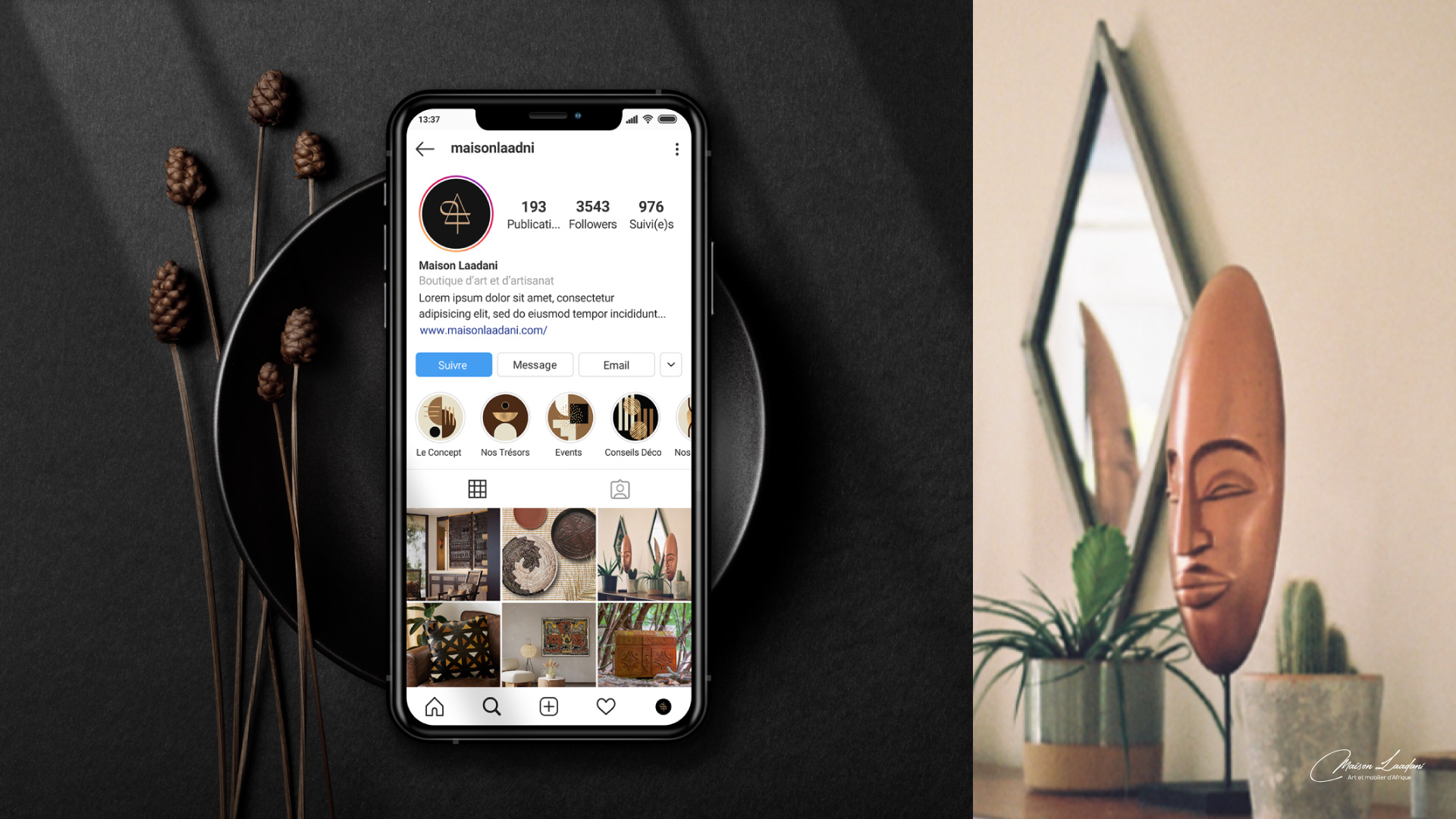 L’identité a également été repensée dans son ensemble afin de traduire un positionnement plus premium : un univers visuel sobre et contemporain, inspiré des matières naturelles et de l’esthétique des objets d’art.